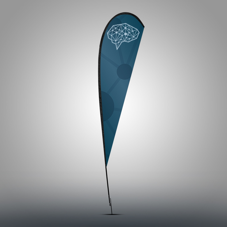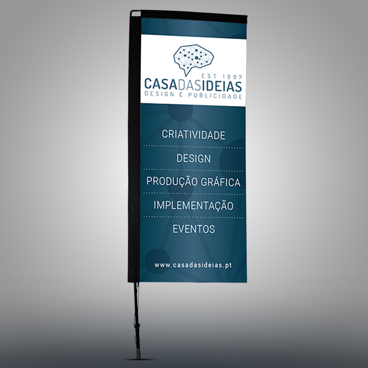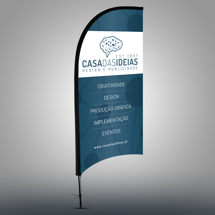 Modelos Gota, Wing e Reta, em várias medidas disponíveis, com suporte de chão. Impressão personalizada em têxtil.